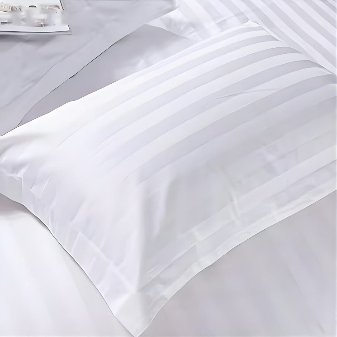 Taie d’oreiller blanche Prestige 250TC à rayures subtiles – 20″ x 30″ x 6″. Elégante, douce et de qualité hôtelière.