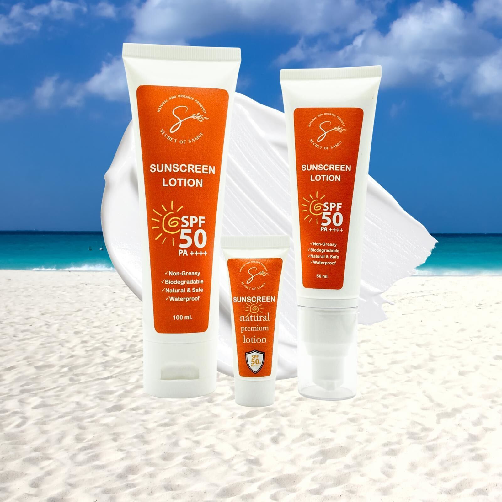 Sunscreen lotion SPF 50 PA++++ for face and body, concentrated texture, quick dry formula, does not feel greasy on the skin, suitable for diving or swimming, as well as environmentally friendly.